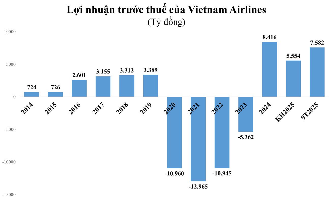 Kết quả, hãng hàng không quốc gia lãi kỷ lục với lợi nhuận trước thuế hợp nhất đạt 7.582 tỷ đồng và lợi nhuận sau thuế hợp nhất đạt 7.174 tỷ đồng, tăng lần lượt 15,3% và 14,5% so với cùng kỳ năm trước, tương ứng lãi sau thuế 26,57 tỷ đồng mỗi ngày. Với mức lãi trước thuế 9 tháng như trên, Vietnam Airlines đã vượt xa kế hoạch lợi nhuận trước thuế hợp nhất 5.554 tỷ đồng đặt ra cho cả năm 2025.
