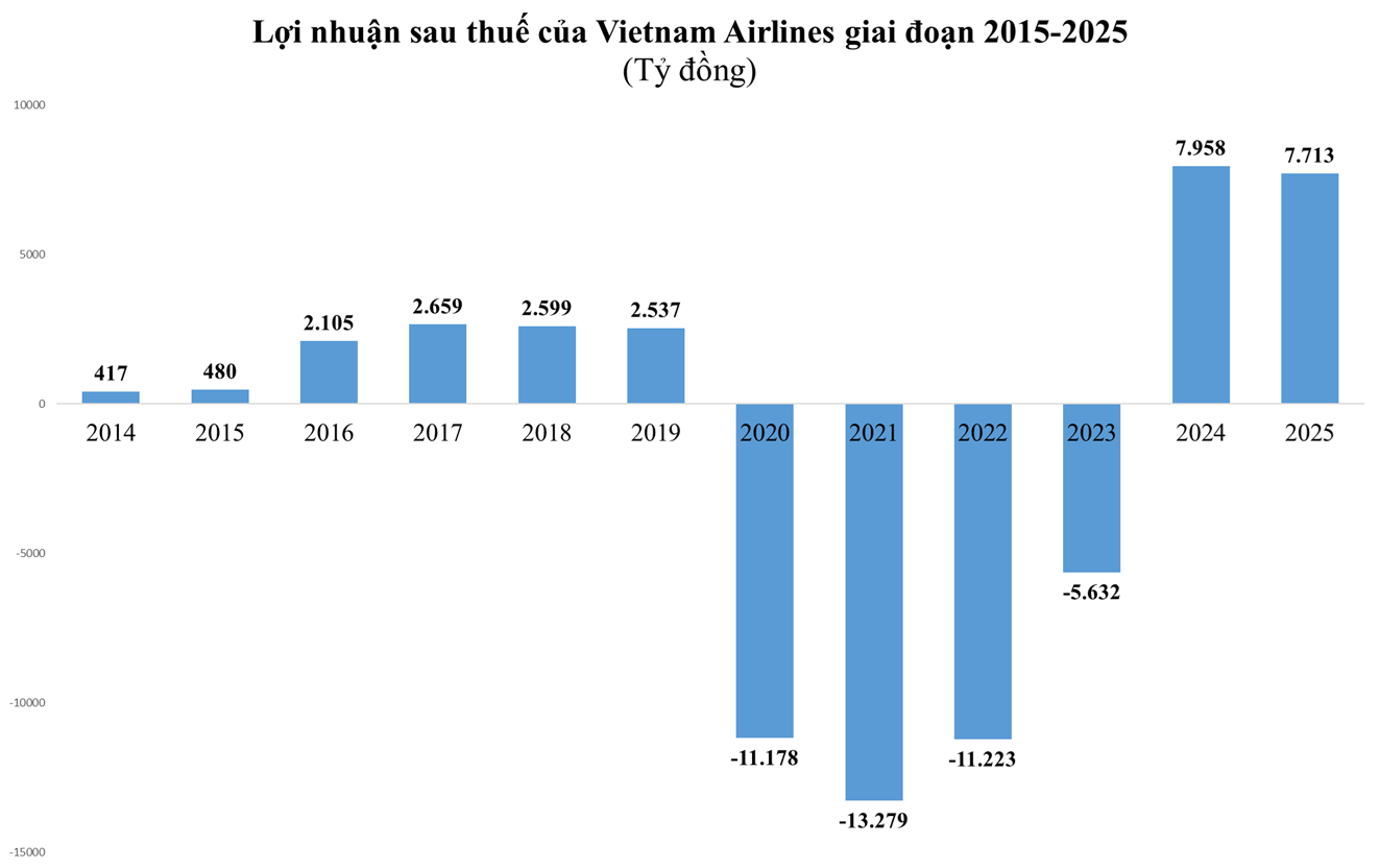 Nhờ kết quả khả quan trong quý IV, lũy kế cả năm 2025, Vietnam Airlines ghi nhận doanh thu hợp nhất hơn 121.429 tỷ đồng, tăng khoảng 10% so với năm trước. Lợi nhuận hợp nhất sau thuế đạt hơn 7.713 tỷ đồng, trong đó lợi nhuận sau thuế công ty mẹ đạt 5.509 tỷ đồng, tăng gấp 2 lần so với cùng kỳ.