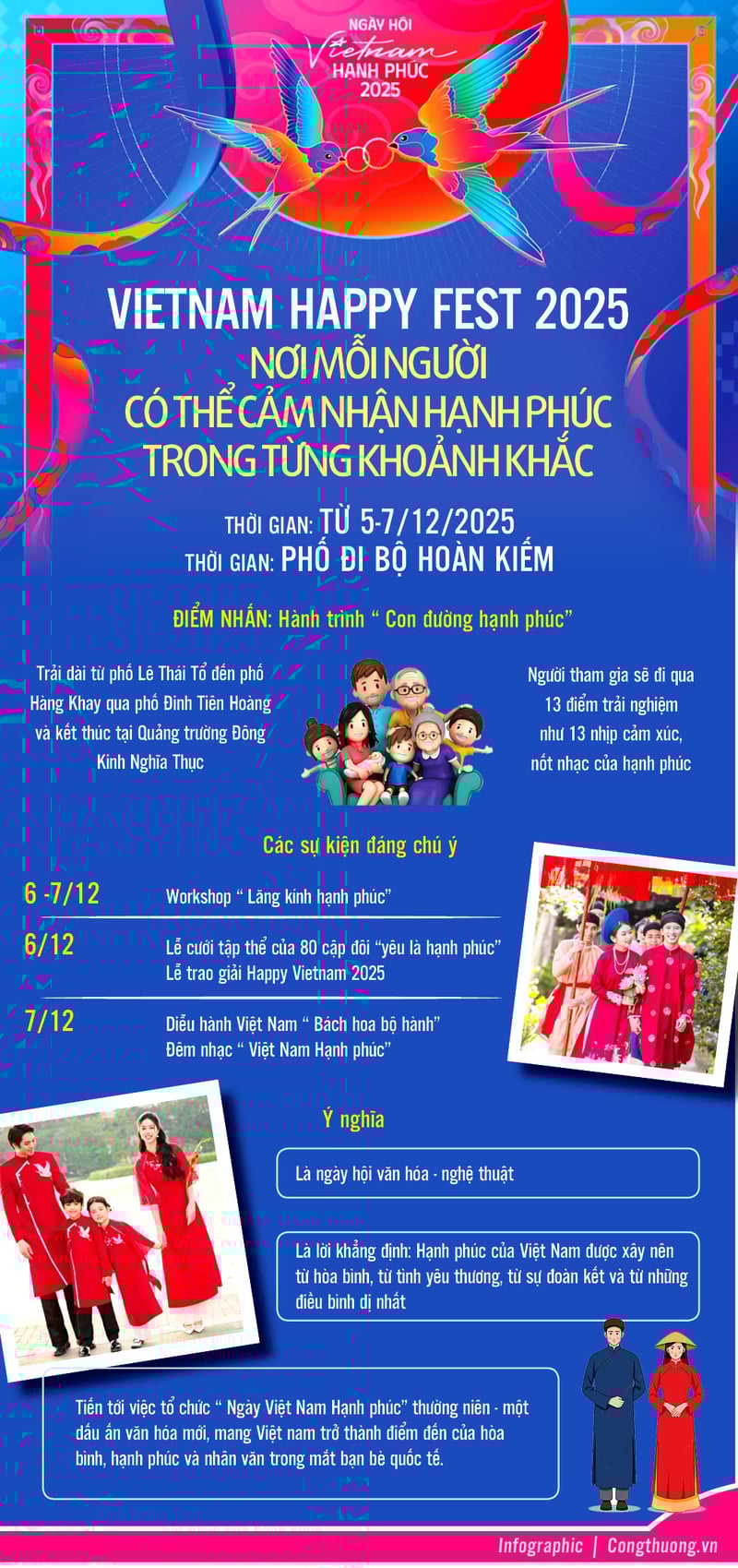 Từ ngày 5 - 7/12/2025 diễn ra Vietnam Happy Fest 2025 - Ngày hội Việt Nam Hạnh phúc tại Phố đi bộ hồ Hoàn Kiếm. Sự kiện do Bộ Văn hóa, Thể thao và Du lịch chủ trì, phối hợp cùng UBND thành phố Hà Nội, Đài Truyền hình Việt Nam và Hội Nghệ sĩ Nhiếp ảnh Việt Nam tổ chức.
