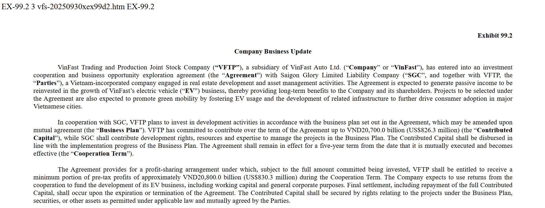 VinFast vừa công bố trên hồ sơ gửi Ủy ban Chứng khoán Mỹ (SEC) kế hoạch hợp tác với Công ty TNHH Saigon Glory - doanh nghiệp sở hữu dự án One Central HCM (còn được biết đến với tên gọi Khu tứ giác Bến Thành). Khoản vốn góp dự kiến tối đa lên tới 20.700 tỷ đồng và mang lại cho VinFast quyền hưởng lợi nhuận trước thuế tối thiểu khoảng 20.800 tỷ đồng trong thời hạn hợp tác.