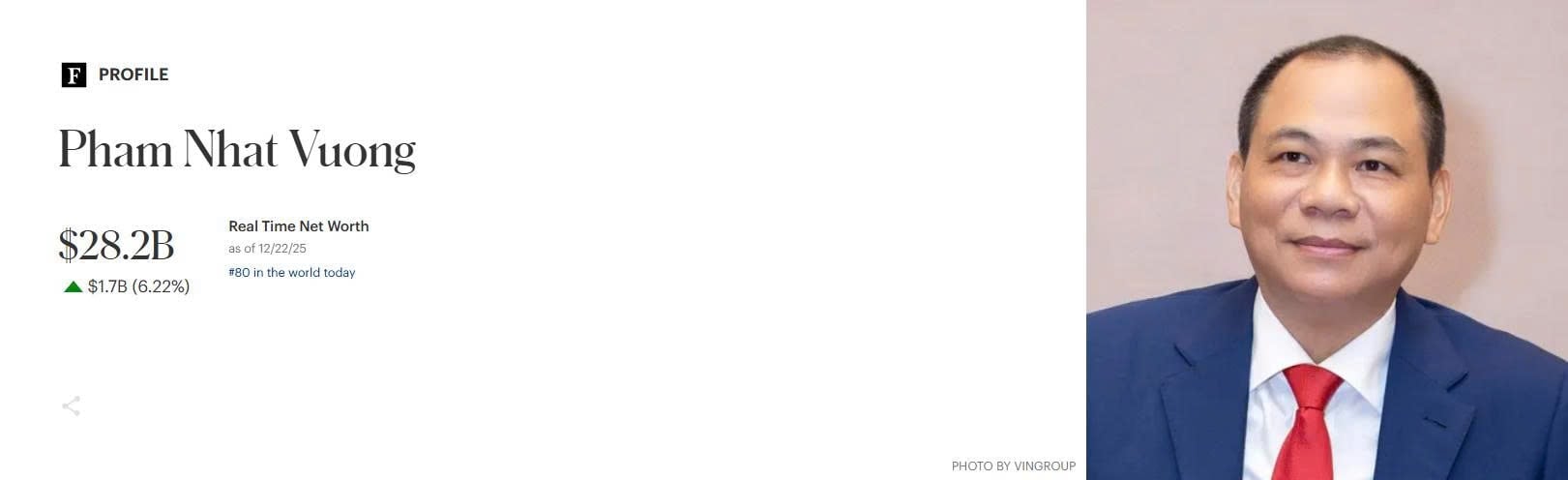Diễn biến tích cực của cổ phiếu VIC cũng kéo theo sự gia tăng mạnh mẽ về giá trị tài sản của Chủ tịch HĐQT Phạm Nhật Vượng. Theo cập nhật từ Forbes, tài sản của ông đã tăng thêm khoảng 1,6 tỷ USD chỉ trong một ngày, lên mức 28,2 tỷ USD, đưa ông vào nhóm 80 người giàu nhất thế giới và tiếp tục thiết lập kỷ lục mới tại Việt Nam.