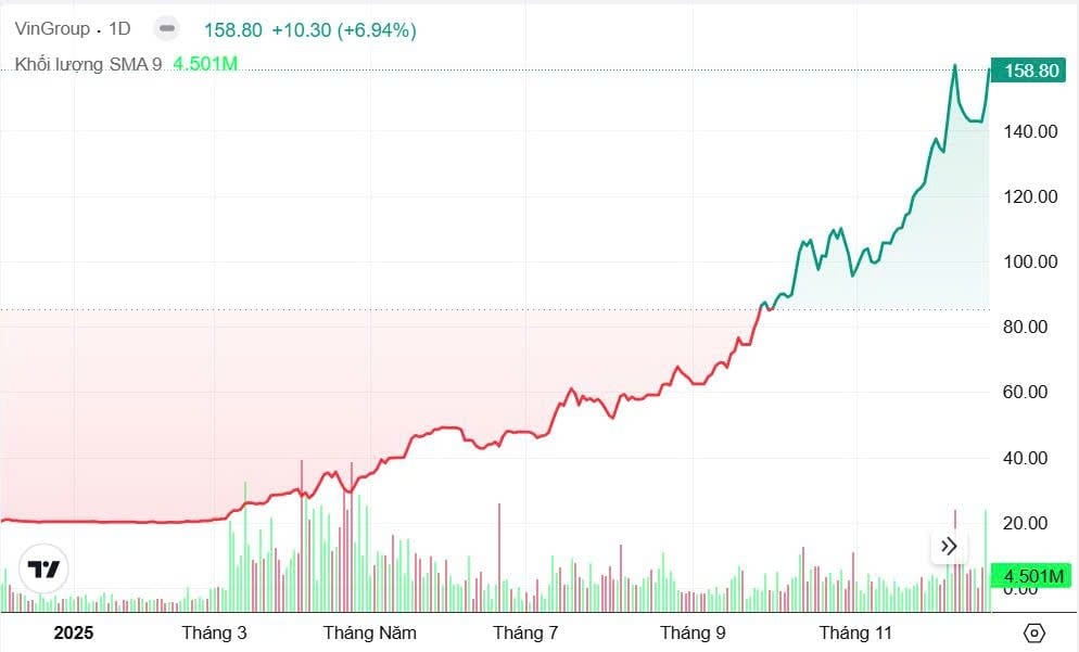 Ngay đầu phiên, cổ phiếu VIC nhanh chóng leo lên mức giá trần 158.800 đồng/cổ phiếu và duy trì trạng thái “trắng bên bán” trong phần lớn thời gian giao dịch. Đây là phiên tăng mạnh thứ hai liên tiếp của mã này, đưa thị giá VIC tiến sát vùng đỉnh lịch sử. Đà tăng mạnh cho thấy lực cầu lớn và tâm lý hưng phấn rõ rệt của nhà đầu tư đối với cổ phiếu đầu tàu của thị trường.
