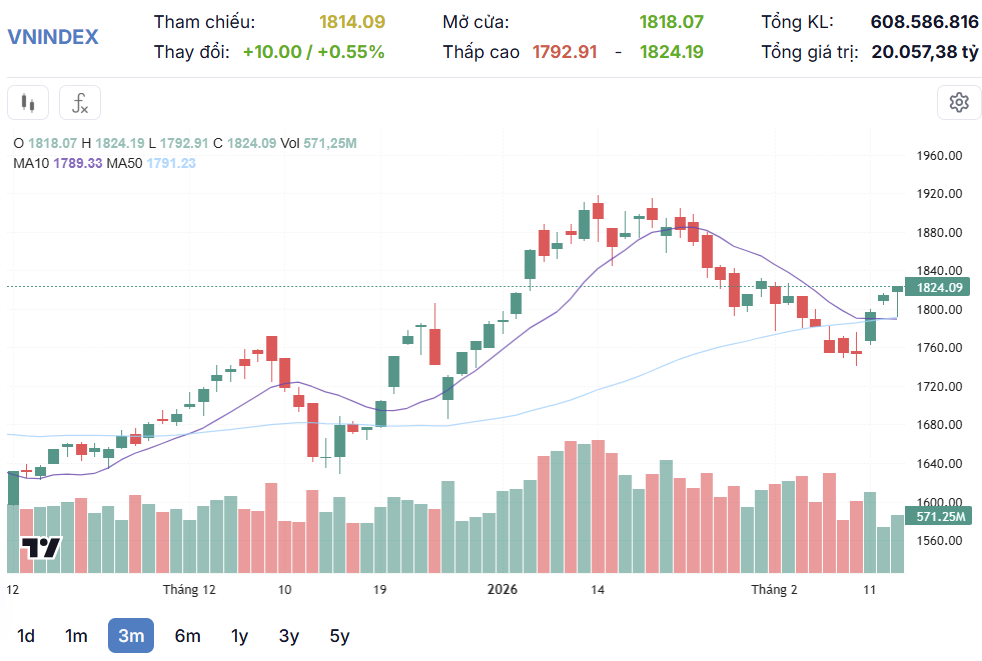 Kết thúc phiên giao dịch, sàn HOSE có 193 mã tăng và 118 mã giảm, VN-Index tăng 10 điểm (+0,55%), lên 1.824,09 điểm. Tổng khối lượng giao dịch đạt hơn 608,5 triệu đơn vị, giá trị đạt 20.057,4 tỷ đồng, tăng 22% về khối lượng và 24% về giá trị so với phiên hôm qua. Giao dịch thỏa thuận đóng góp hơn 37,3 triệu đơn vị, giá trị đạt 1.235 tỷ đồng.