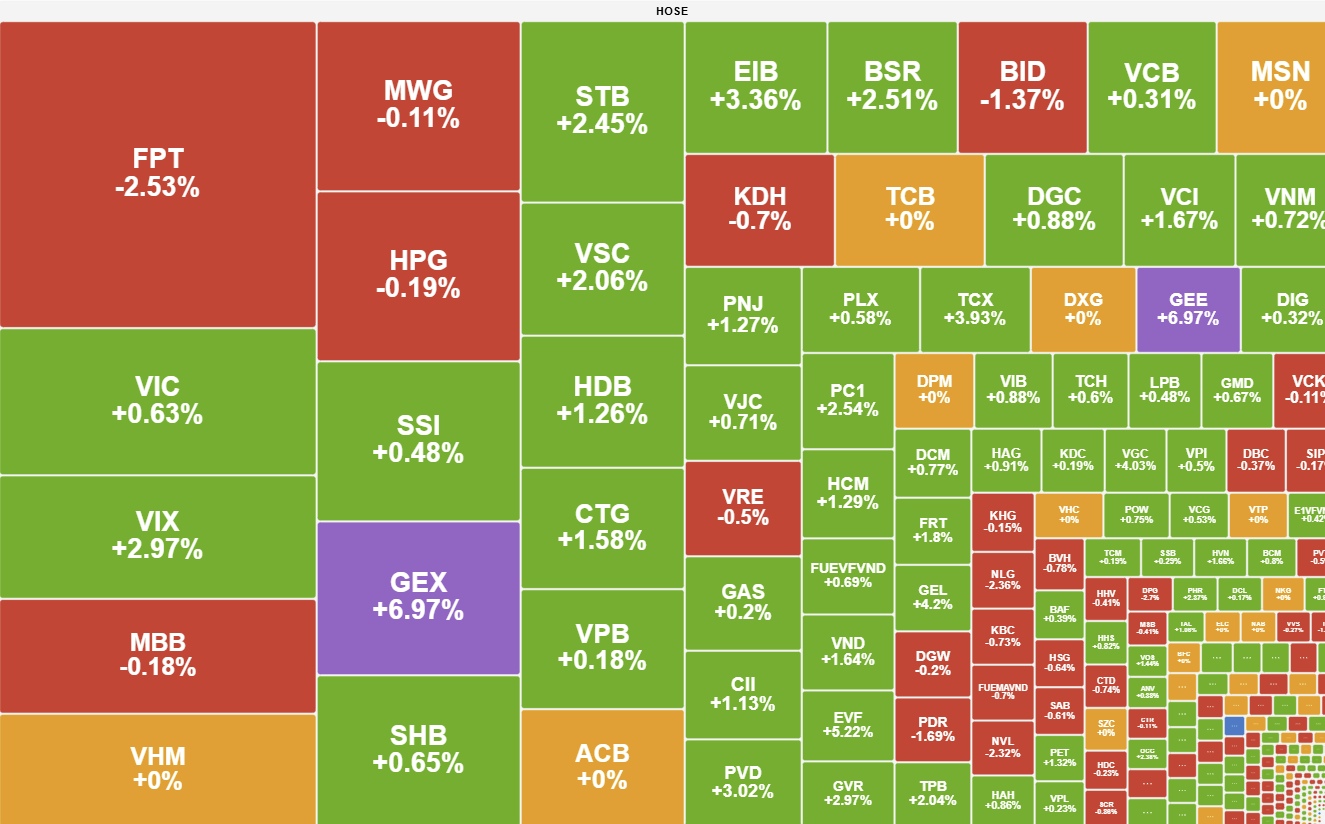 Cục diện thị trường chỉ thực sự thay đổi vào cuối ngày khi bảng điện tử bất ngờ khởi sắc trở lại. "Ngòi nổ" đến từ nhóm cổ phiếu họ Gelex với đà tăng mạnh mẽ, đóng vai trò là tâm điểm thu hút dòng tiền hiếm hoi trong phiên. Sự tích cực này nhanh chóng lan tỏa sang nhóm Bluechips, giúp hàng loạt mã vốn hóa lớn đảo chiều tăng điểm ấn tượng. Nhờ lực đẩy đồng thuận vào giờ chót, VN-Index đã bứt phá mạnh mẽ, đóng cửa tại mức cao trên 1.820 điểm. Đây được xem là cái kết viên mãn cho năm Ất Tỵ, tạo tâm lý hứng khởi cho nhà đầu tư trước khi bước vào kỳ nghỉ lễ dài ngày.