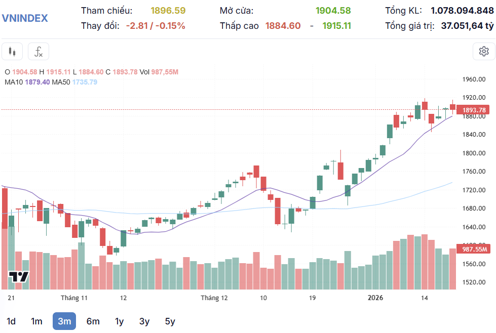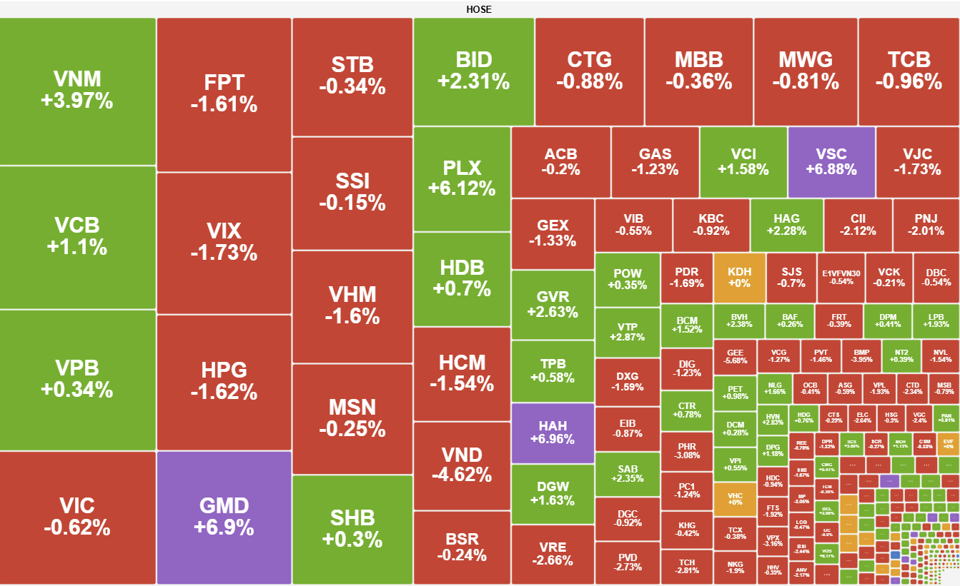 Kết thúc phiên giao dịch, sàn HOSE có 149 mã tăng và 180 mã giảm, VN-Index giảm 2,81 điểm (-0,15%), xuống 1.893,78 điểm. Tổng khối lượng giao dịch đạt hơn 1,07 tỷ đơn vị, giá trị đạt 37.051,6 tỷ đồng, giảm 7% về khối lượng và chỉ 1% về giá trị so với phiên hôm qua. Giao dịch thỏa thuận đóng góp hơn 90,5 triệu đơn vị, giá trị đạt 4.080 tỷ đồng.