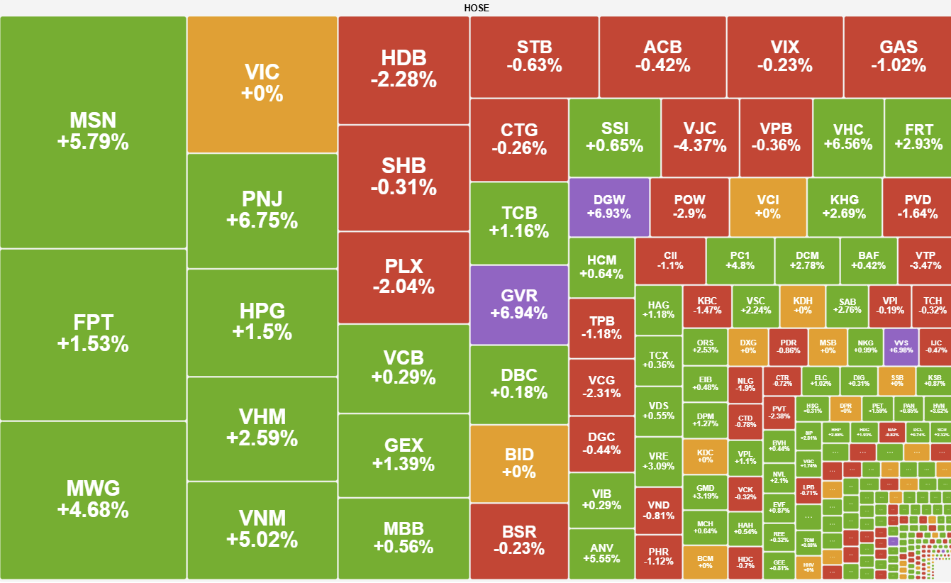 Trong bối cảnh đó, nhóm cổ phiếu bán lẻ và xuất nhập khẩu bất ngờ trở thành điểm sáng với diễn biến tăng điểm đầy ấn tượng, tiêu biểu như MSN, DGW, VHC và ANV với mức tăng trên 3%. Tuy nhiên, thanh khoản phiên sáng sụt giảm mạnh tới 38% so với phiên trước, cho thấy dòng tiền vẫn đang trong trạng thái quan sát và giao dịch khá trầm lắng.