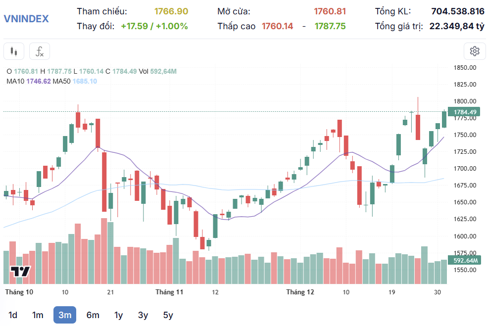Kết thúc phiên giao dịch, VN-Index tăng 17,59 điểm (+1,00%) lên 1.784,49 điểm, với 134 mã tăng và 185 mã giảm. Tổng khối lượng giao dịch đạt 704 triệu đơn vị, giá trị đạt 22.349,8 tỷ đồng, tăng 10% về khối lượng và 8% về giá trị so với phiên hôm qua. Trong đó, giao dịch thỏa thuận đóng góp 111,9 triệu đơn vị, giá trị đạt 3.734 tỷ đồng.