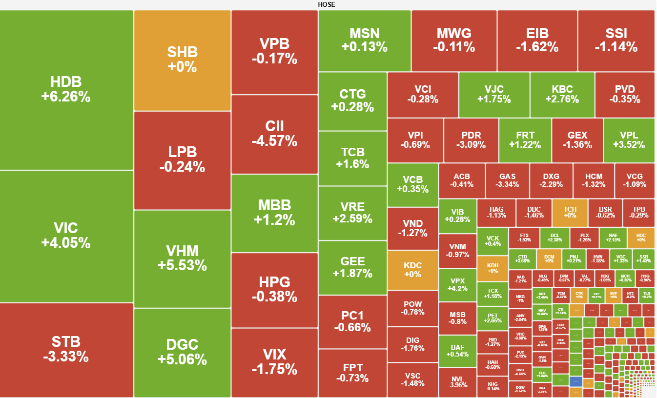Tại nhóm ngân hàng, ấn tượng nhất là HDB khi bứt lên trở thành mã tăng mạnh nhất rổ VN30 với mức tăng 6,26%, khớp gần 44 triệu đơn vị. Ngoài HDB, có TCB và SSB tăng hơn 1%, VCB, VIB, CTG chỉ tăng nhẹ, cùng NAB, SHB đứng tham chiếu, còn lại đều giảm. Ở chiều ngược lại, giảm mạnh nhất là STB khi mất 3,33% xuống 58.000 đồng. Có 2 mã giảm hơn 1% là BID giảm 1,27% xuống 38.900 đồng và EIB giảm 1,62% xuống 21.300 đồng.