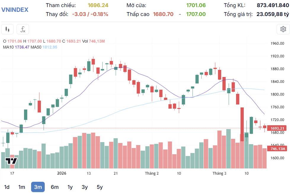 (Banker.vn) VN-Index trải qua một phiên giao dịch đầy sóng gió khi áp lực bán tại nhóm vốn hóa lớn đẩy chỉ số có lúc thủng mốc 1.680 điểm. Tuy nhiên, sự bứt phá của nhóm bất động sản cùng lực cầu bắt đáy tại nhóm ngân hàng cuối phiên đã giúp thị trường thu hẹp đáng kể đà giảm.