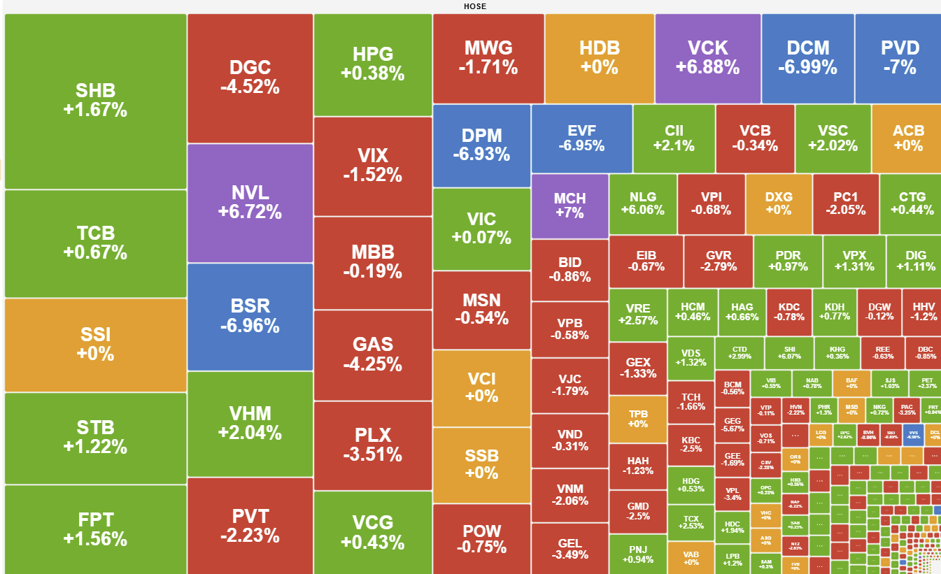 margin: 15px auto;" />Thị trường khởi động phiên sáng trong sắc xanh nhẹ với mức tăng 4 điểm nhờ lực đẩy từ các "ông lớn" như FPT, STB và VHM. Tuy nhiên, áp lực bán nhanh chóng dâng cao tại nhóm dầu khí (BSR, GAS) và các mã trụ cột như DGC, MWG, VNM.