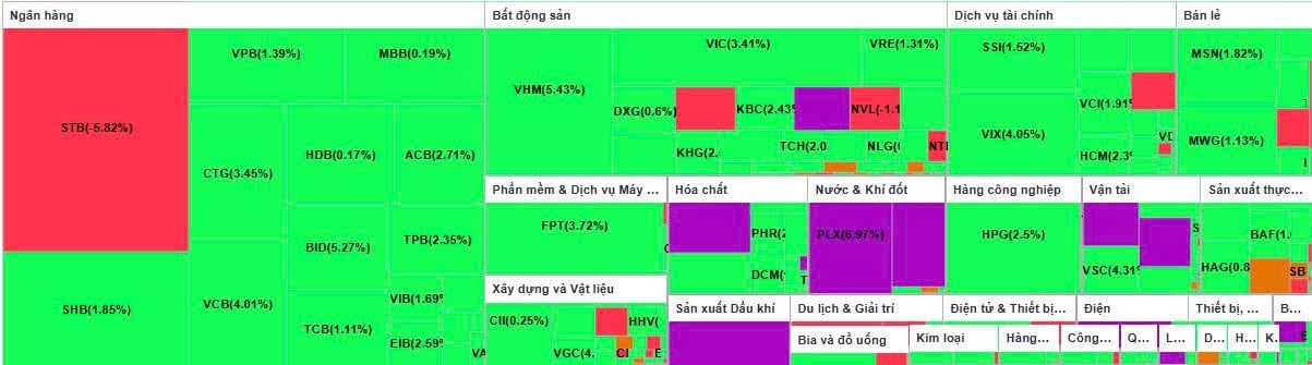 Nhóm ngân hàng tiếp tục là trụ cột quan trọng của thị trường. Ngoại trừ STB giảm mạnh do áp lực bán từ khối ngoại, phần lớn cổ phiếu ngân hàng đều giữ được sắc xanh. BID dẫn đầu đà tăng với mức tăng trên 5%, tiếp theo là VCB tăng hơn 4% và CTG tăng gần 3,5%. Bộ ba này đóng góp thêm hơn 9 điểm cho VN-Index. Các mã khác như ACB, TPB, EIB, SHB hay VIB cũng tăng khá, phản ánh dòng tiền vẫn tập trung mạnh vào nhóm ngành này.