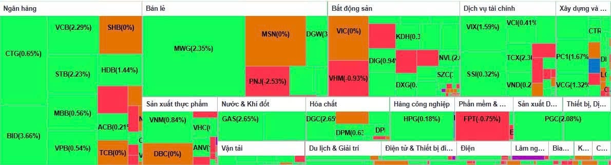 Động lực chính giúp chỉ số đi lên đến từ nhóm ngân hàng. Hai cổ phiếu trụ cột là BID và VCB đóng góp gần 6 điểm cho VN-Index, với mức tăng lần lượt 3,7% và 2,3%. Đây cũng là nhóm thu hút dòng tiền tốt nhất trong phiên sáng, đóng vai trò “giữ nhịp” cho thị trường.