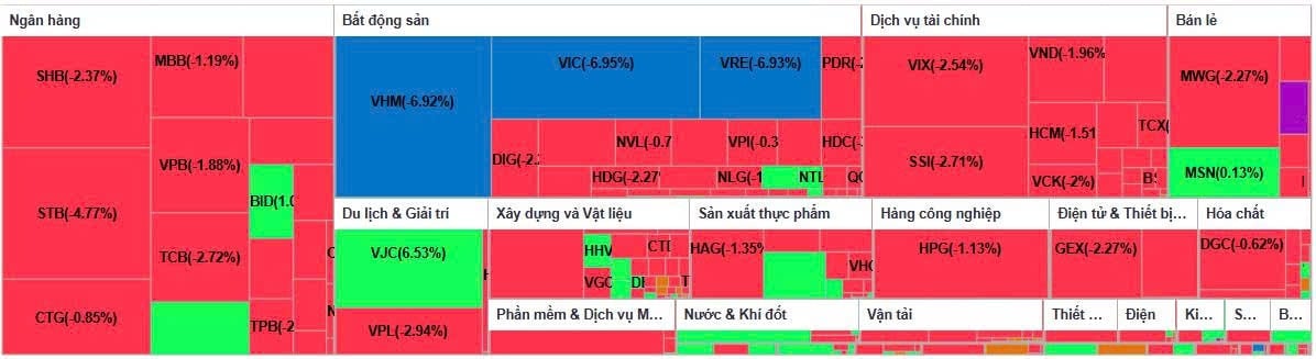 Tâm điểm gây áp lực lớn nhất lên thị trường là nhóm cổ phiếu họ Vingroup. Sau giai đoạn tăng mạnh trước đó, loạt mã lớn như VIC, VHM, VRE và VPL đồng loạt chịu áp lực bán mạnh, giảm từ gần 3% đến xấp xỉ 7%. Nhóm cổ phiếu này trở thành “gánh nặng” chính kéo chỉ số chung lao dốc trong phiên chiều.