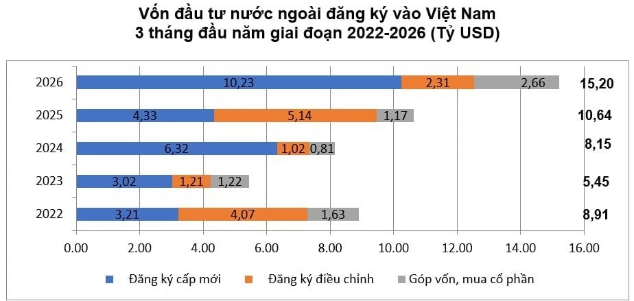 Tổng vốn đầu tư nước ngoài đăng ký vào Việt Nam tính đến ngày 31/3/2026 (gồm: vốn đăng ký cấp mới, vốn đăng ký điều chỉnh và giá trị góp vốn, mua cổ phần của nhà đầu tư nước ngoài) đạt 15,20 tỷ USD, tăng 42,9% so với cùng kỳ năm trước.