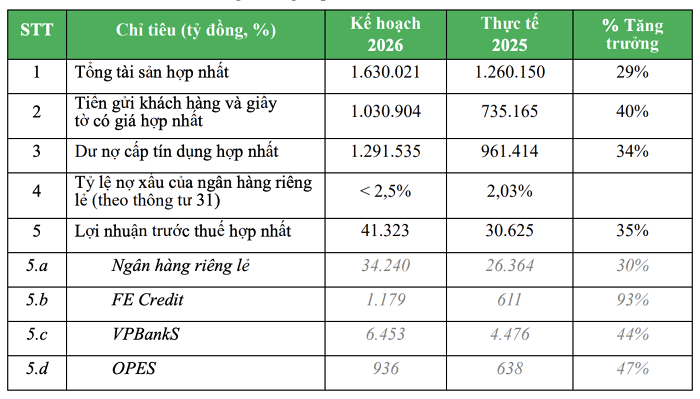 Đối với ngân hàng mẹ, VPBank đặt mục tiêu lợi nhuận trước thuế đạt 34.240 tỷ đồng, tăng 30%. Tổng tài sản riêng lẻ dự kiến gần 1,5 triệu tỷ đồng, tăng 27%, trong khi dư nợ tín dụng và huy động vốn đều hướng tới mức tăng trưởng trên 30%. Ngân hàng cũng đặt mục tiêu kiểm soát tỷ lệ NHNN.">nợ xấu dưới 2,5% theo quy định của Ngân hàng Nhà nước.