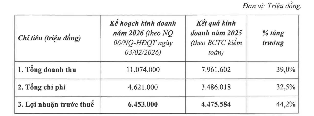 Theo đó, VPBankS đặt kế hoạch năm 2026 với tổng doanh thu 11.074 tỷ đồng và lợi nhuận trước thuế 6.453 tỷ đồng, tăng lần lượt 39% và 44,2% so với thực hiện năm 2025. Trước đó, năm 2025, VPBankS ghi nhận doanh thu 7.177 tỷ đồng và lợi nhuận trước thuế 4.450 tỷ đồng, tăng trưởng đột biến so với năm 2024, đồng thời vượt 11% kế hoạch doanh thu và 0,6% chỉ tiêu lợi nhuận.