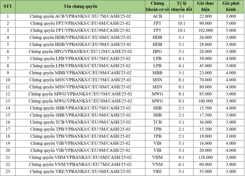 Thông tin về 23 chứng quyền có bảo đảm do VPBankS phát hành. (Ảnh: VPBankS).