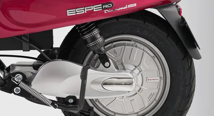 Trọng lượng xe khoảng 90 kg, giúp cân bằng giữa độ đầm chắc và khả năng linh hoạt khi sử dụng. Espero Diamond Ultra được trang bị hệ thống phanh gồm phanh đĩa phía trước và phanh cơ phía sau, giúp người lái kiểm soát tốc độ tốt hơn trong các tình huống bất ngờ.