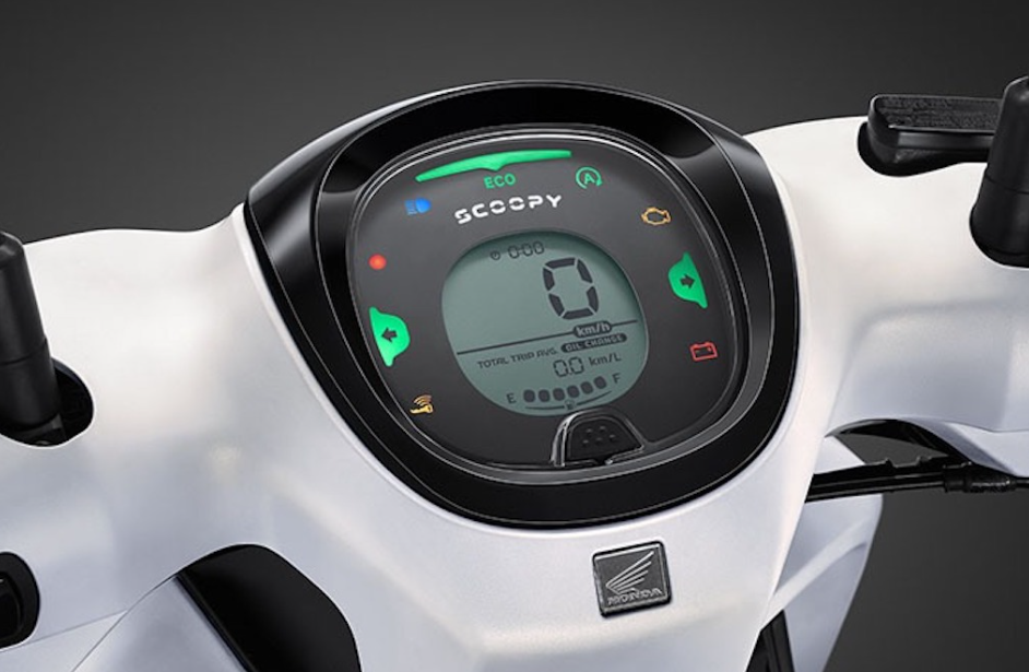 Scoopy mới sử dụng màn hình Digital Panel Meter, hiển thị đầy đủ tốc độ, đồng hồ điện tử, mức xăng, mức tiêu hao nhiên liệu trung bình và theo thời gian thực, tripmeter, báo Smart Key, báo pin và đèn ECO hướng dẫn lái xe tiết kiệm.