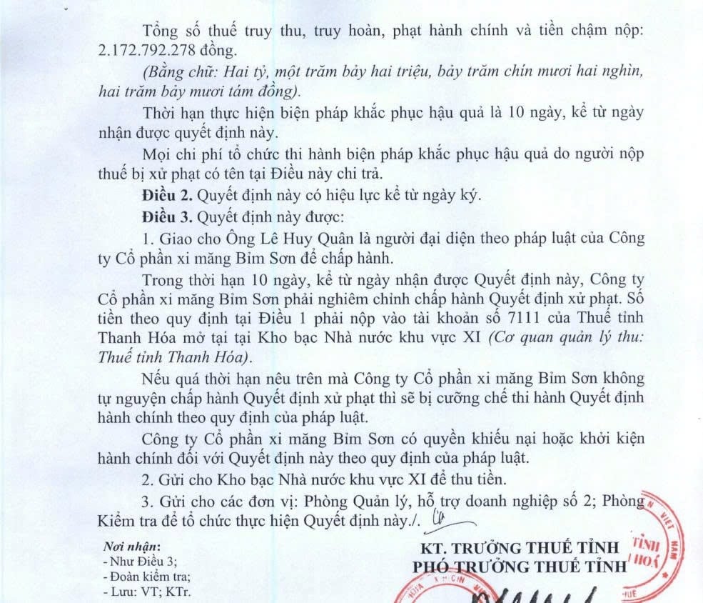 Ngày 31/3/2026, Công ty CP Xi măng Bỉm Sơn thông báo đã nhận quyết định của Cục Thuế tỉnh Thanh Hóa liên quan đến xử phạt vi phạm hành chính trong lĩnh vực thuế và hóa đơn.