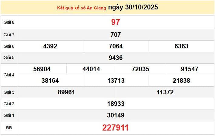 XSAG 30/10, KQXSAG 30/10. Xem lại kết quả xổ số An Giang ngày 30/10/2025