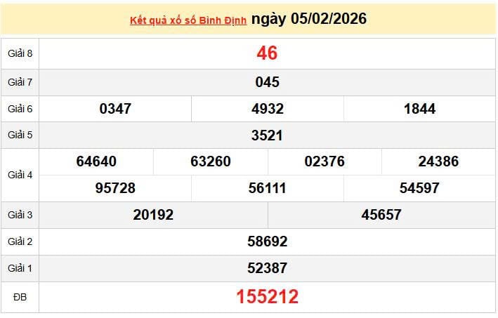XSBDI 5/2 KQXSBDI 5/2. Xem lại kết quả xổ số Bình Định ngày 5/2/2026