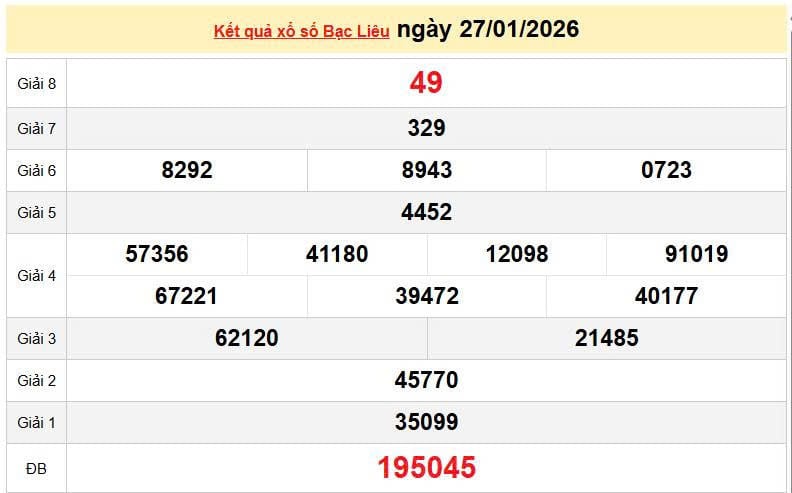 XSBL 27/1, KQXSBL 27/1. Xem lại kết quả xổ số Bạc Liêu ngày 27/1/2026