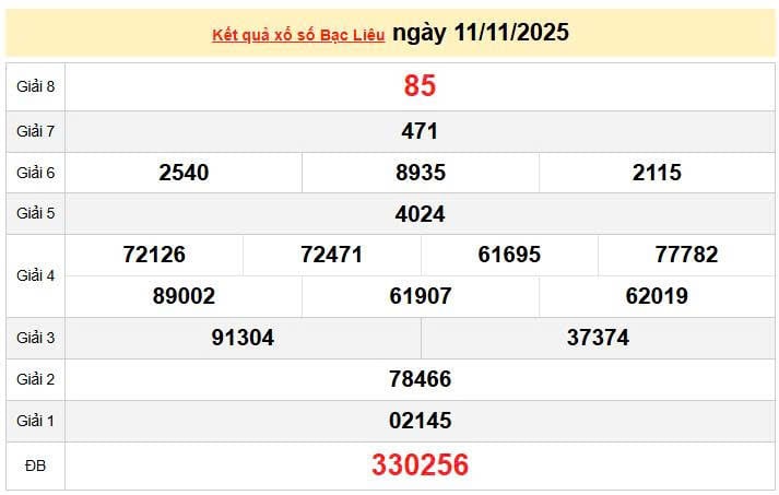 XSBL 11/11, KQXSBL 11/11. Xem lại kết quả xổ số Bạc Liêu ngày 11/11/2025