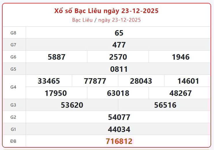 XSBL 23/12, KQXSBL 23/12. Xem lại kết quả xổ số Bạc Liêu ngày 23/12/2025