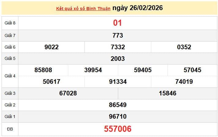 XSBTH 26/2, KQXSBTH 26/2. Xem lại kết quả xổ số Bình Thuận ngày 26/2/2026