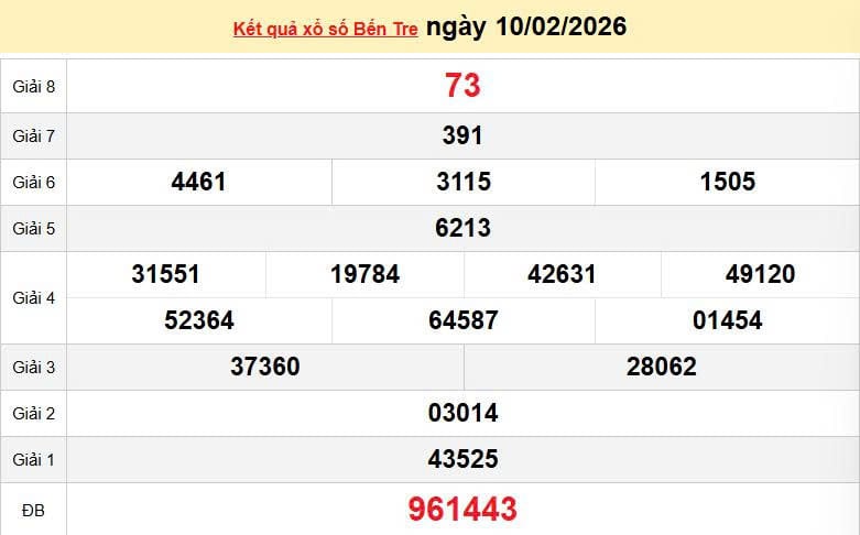 XSBTR 10/2, KQXSBTR 10/2. Xem lại kết quả xổ số Bến Tre ngày 10/2/2026