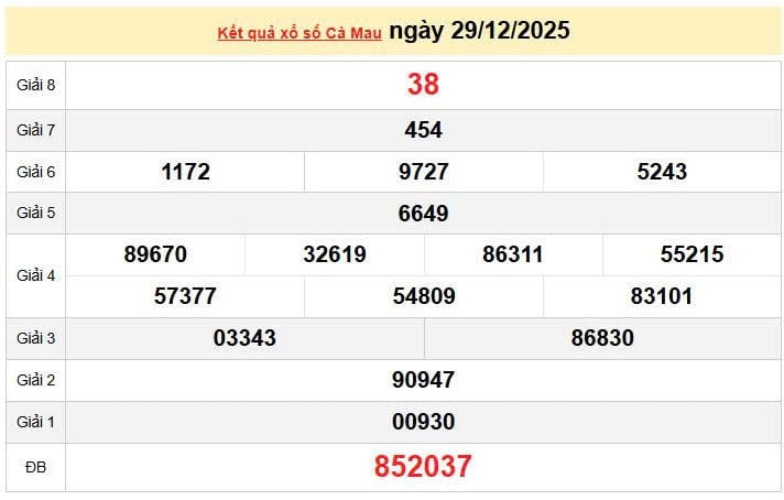 XSCM 29/12, KQXSCM 29/12, kết quả xổ số Cà Mau ngày 29/12/2025