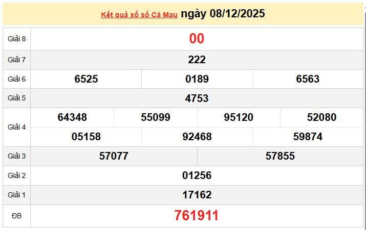 XSCM 8/12, KQXSCM 8/12. Xem lại kết quả xổ số Cà Mau ngày 8/12/2025