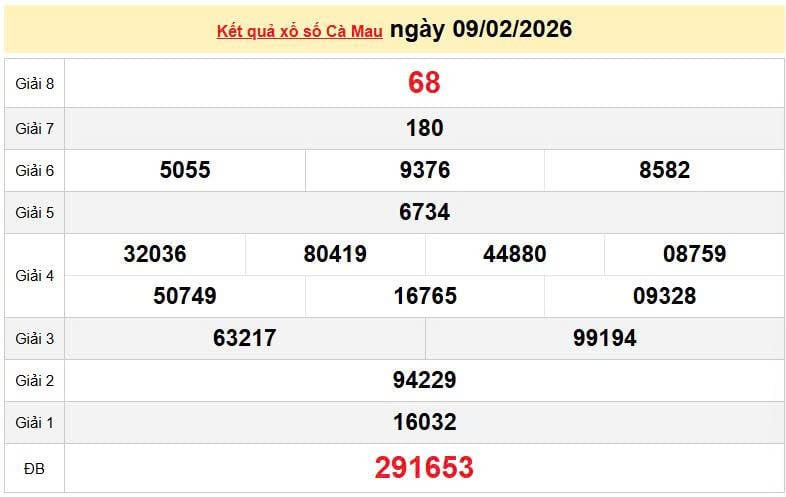 XSCM 9/2, KQXSCM 9/2. Xem lại kết quả xổ số Cà Mau ngày 9/2/2026