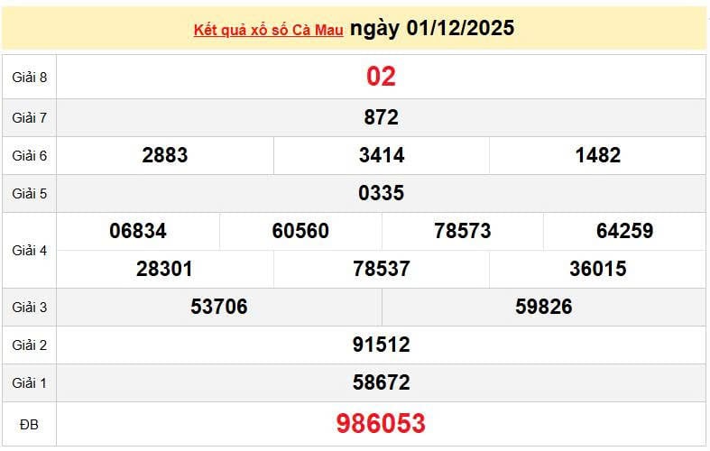 XSCM 1/12, KQXSCM 1/12. Xem lại kết quả xổ số Cà Mau ngày 1/12/2025