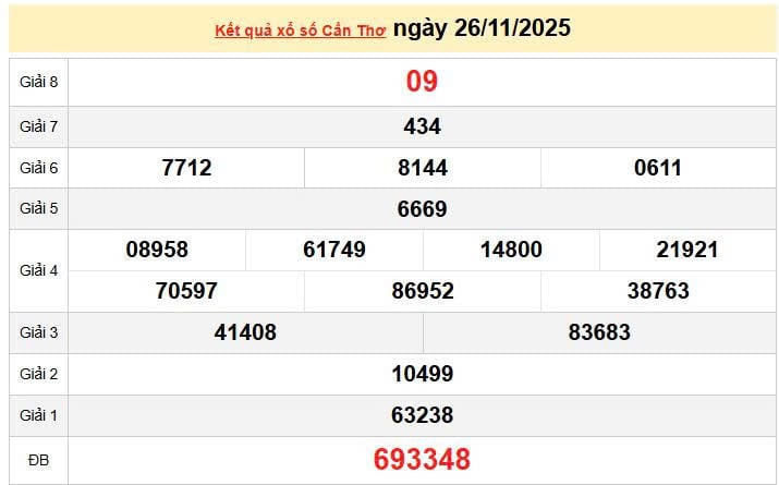 XSCT 26/11, KQXSCT 26/11. Xem lại kết quả xổ số Cần Thơ ngày 26/11/2025