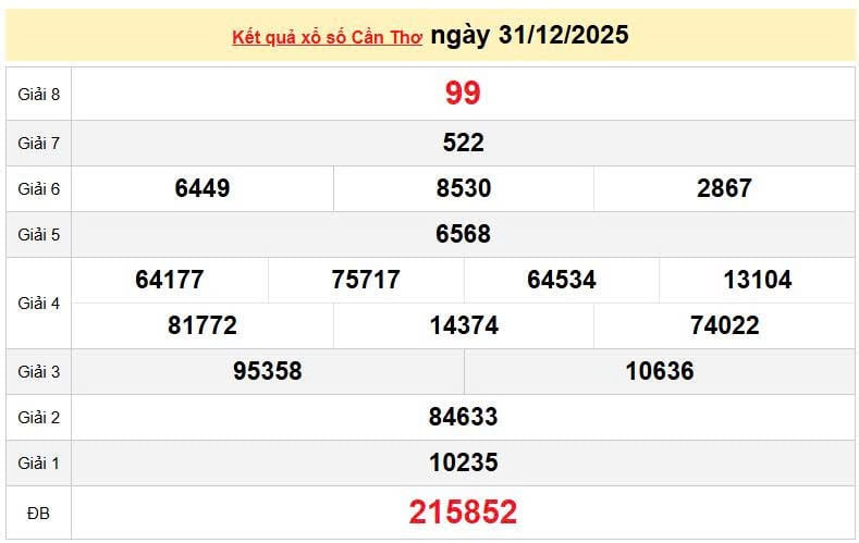 XSCT 31/12, KQXSCT 31/12. Xem lại kết quả xổ số Cần Thơ ngày 31/12/2025