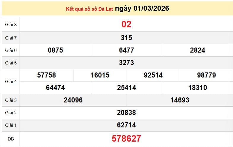 XSDL 1/3, KQXSDL 1/3. Xem lại kết quả xổ số Đà Lạt ngày 1/3/2026