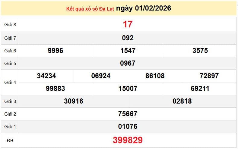 XSDL 1/2, KQXSDL 1/2. Xem lại kết quả xổ số Đà Lạt ngày 1/2/2026