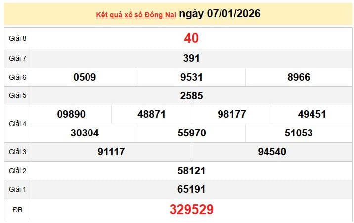 XSDN 7/1, KQXSDN 7/1. Xem lại kết quả xổ số Đồng Nai ngày 7/1/2026
