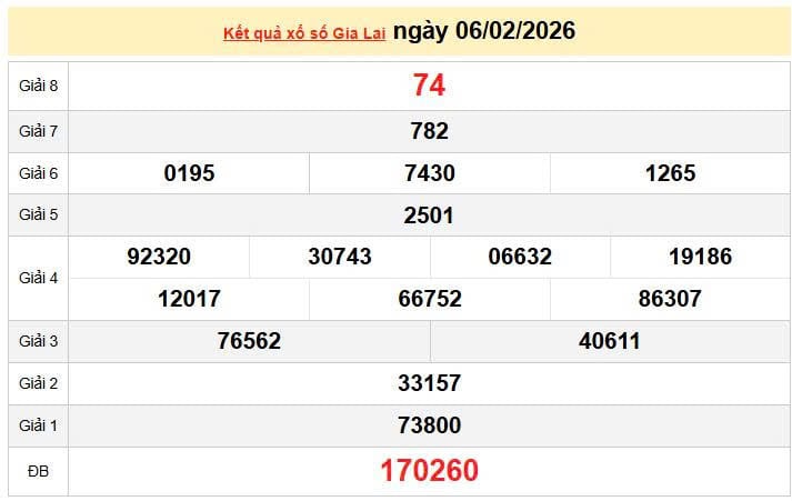 XSGL6/2, KQXSGL6/2. Xem lại kết quả xổ số Gia Lai ngày 6/2/2026
