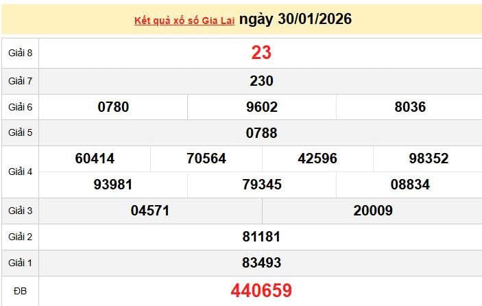 XSGL30/1, KQXSGL330/1. Xem lại kết quả xổ số Gia Lai ngày 30/1/2026