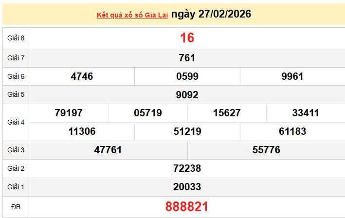 XSGL 27/2, KQXSGL 27/2, kết quả xổ số Gia Lai ngày 27/2/2026