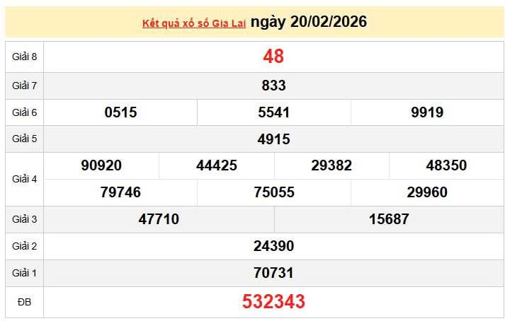 XSGL 20/2, KQXSGL 20/2, kết quả xổ số Gia Lai ngày 20/2/2026