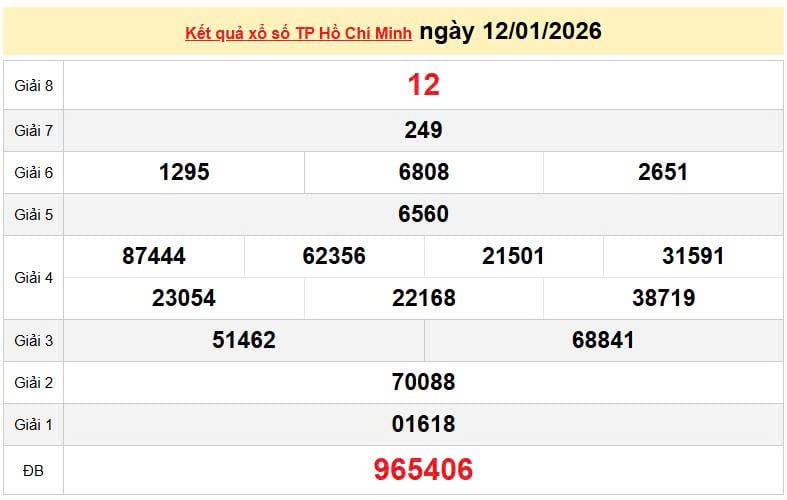 XSHCM 12/1, KQXSHCM 12/1. Xem lại kết quả xổ số Hồ Chí Minh ngày 12/1/2026