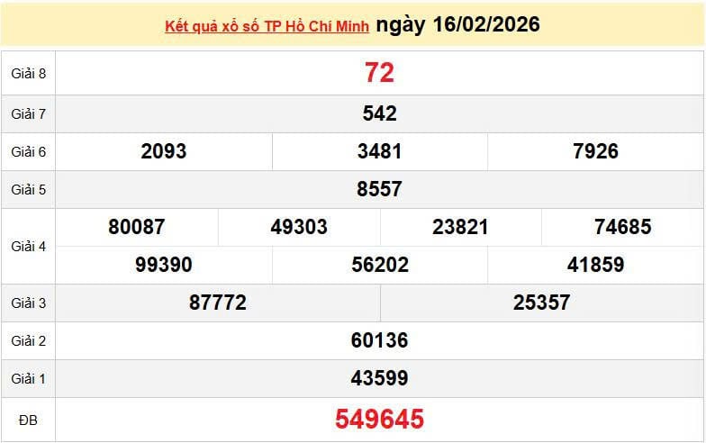 XSHCM 16/2, KQXSHCM 16/2. Xem lại kết quả xổ số TP. Hồ Chí Minh ngày 16/2/2026