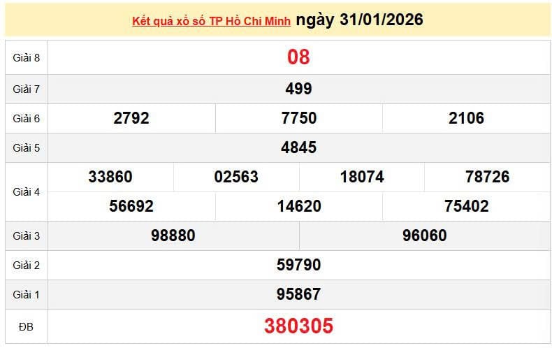XSHCM 31/1, KQXSHCM 31/1. Xem lại kết quả xổ số Hồ Chí Minh ngày 31/1/2026