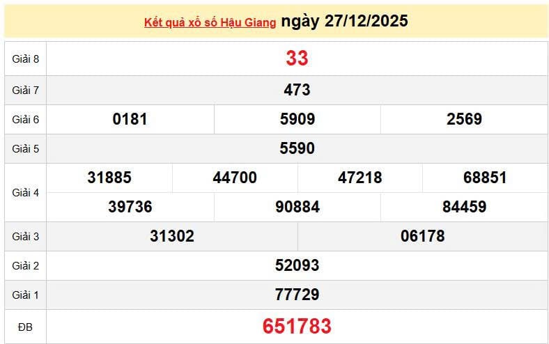 XSHG 27/12, KQXSHG 27/12. Xem lại kết quả xổ số Hậu Giang ngày 27/12/2025