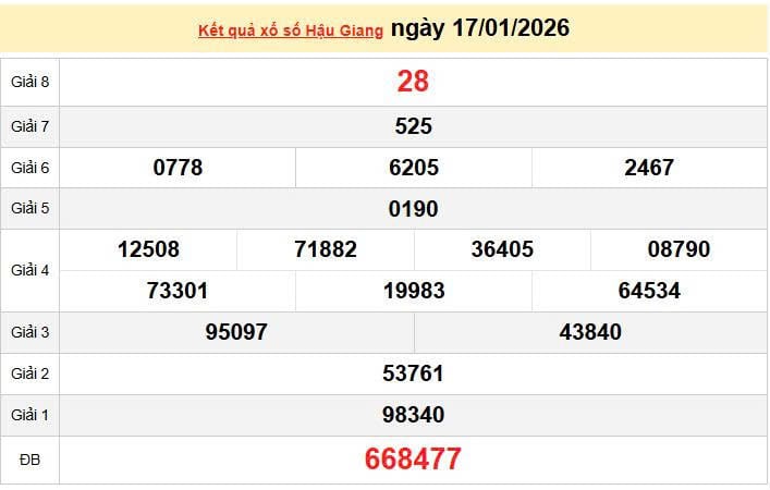 XSHG 17/1, KQXSHG 17/1. Xem lại kết quả xổ số Hậu Giang ngày 17/1/2026