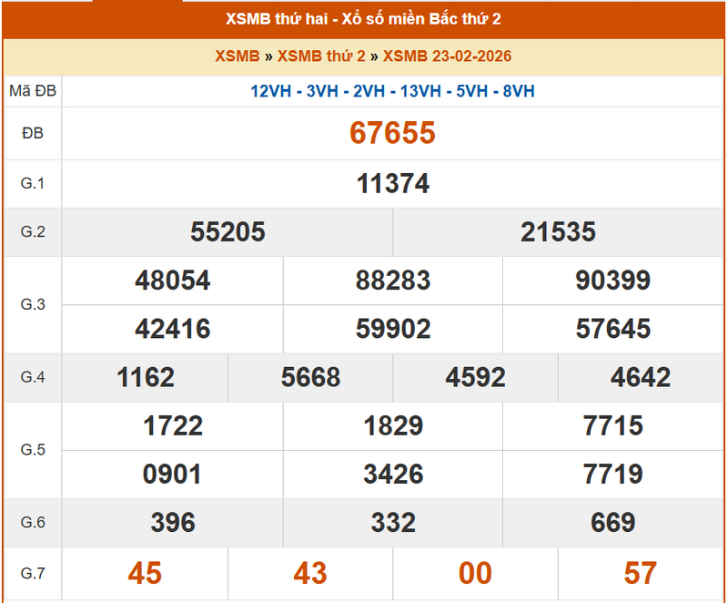XSHN 23/2, KQXSHN 23/2. Xem lại kết quả xổ số Hà Nội ngày 23/2/2026